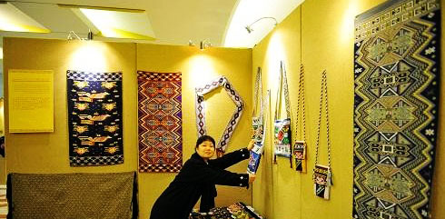 Seven representative heritors of the brocade like Liu Dai’s exhibited 29 pieces of works with distinctive features of Tujia minority, including wall hangings, slippers, satchels, scarves, shawls, and costumes.