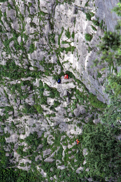 Explorers are climbing down by rope