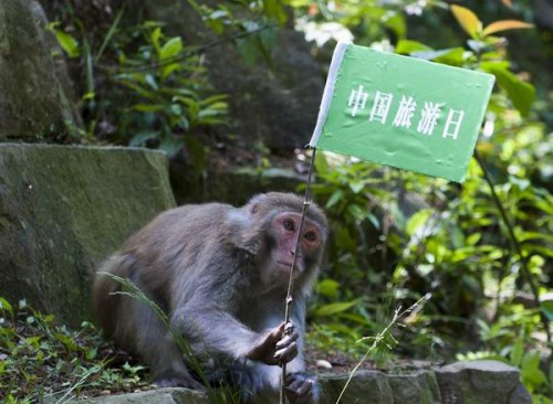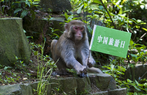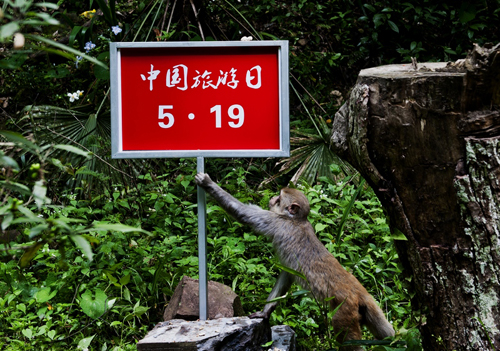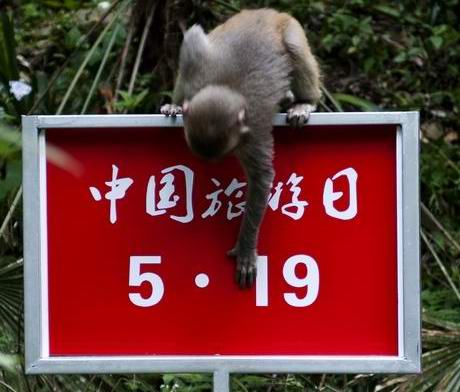 May 19, is the first “China Tourism Day “, organized large-scale celebration of Zhangjiajie City, thousands of tourists come together, in Zhangjiajie National Forest Park, Zhangjiajie scenic spot of the monkeys not only watch the show, also played on the “China Tourism Day “advocate. Some of them are jump to the “China Tourism Day”promotion board, some holding banners, all of them avid. The following pictures from the Internet.