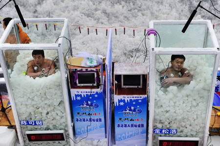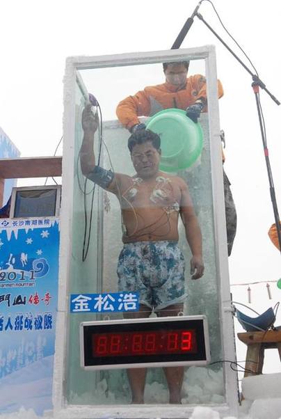 The Chinese “Icemen” Chen Kecai (left) and Jin Songhao (right) stand in a plastic box during a cold endurance competition in Zhangjiajie on Jan. 3, 2011. Jin Songhao and the other challenger Chen Kecai, both from Northeast China’s Helongjiang province, took part in an ice endurance contest held on Tianmen Mountain on Monday, in which the two stayed in ice wearing nothing but a swimsuit. Jin Songhao dwarfed Wim Hof’s world record for the longest ice bath by immersing himself in ice for 120 minutes while Chen last for 118 minutes. The previous world record was 115 minutes, which was made by Dutch “Iceman” Win Hof on Dec 30, 2010.