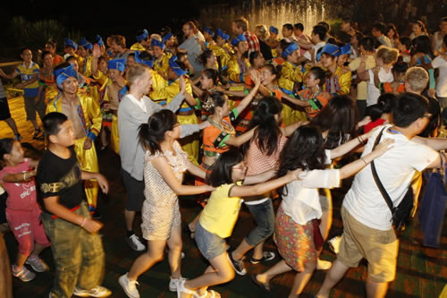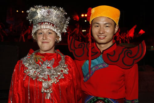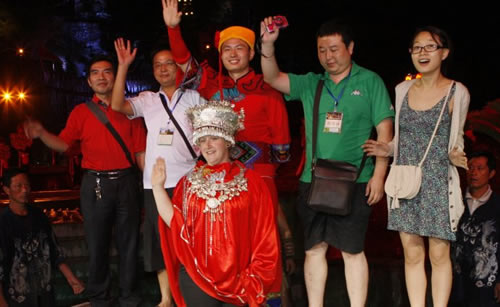 On that night, Timashenge was put on as usual in Baofeng Lake. The wedding ceremony took place there amid the crisp and joyful sound of Suona (Chinese Horn). The groom Peng Xinxin and the bride Christine, dressed in red traditional costumes of Tujia wedding, walked onto the stage, accompanied by over 10 Tujia girls and boys. During the wedding, the bride, wearing Tujia silver jewelry , was carried by the groom and sent to a sedan chair. More than one thousand tourists witnessed the ceremony in high spirits.