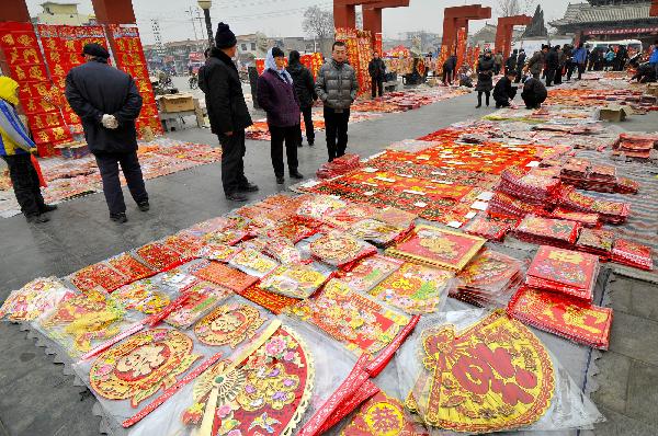 Citizens purchase New Year decorations in a market in Yuncheng, north China’s Shanxi Province, Jan. 27, 2011. People started to prepare for the upcoming Chinese Spring Festival, which falls on Feb. 3. (Xinhua/Yan Xin)