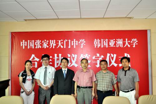 Joint management of the agreement was reached between Zhangjiajie Tianmen Middle School and South Korea’s Asia University.May 10, 2011, signing ceremony held at Zhangjiajie Jishou University. Leaders of both:Wu Wuxiang and Li Donglie, attended the signing ceremony.
