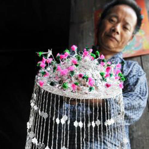 Ma Maoting shows a silver headpiece he handmade in a flashback to ancient times on July 24, 2013. Sixty-year-old Ma is from Huangmaoping village of Xiangxi Tujia and Miao autonomous prefecture in Hunan province. The village has been famous for handmade silver jewelry from ancient times and Ma is the 5th-generation of his family to make a living from their handicraft. It takes nearly 30 steps to make a piece of silver jewelry of the Miao ethnic group. Ma Maoting was honored as heir to Miao ethnic group silver jewelry forging skill in national intangible cultural heritage status in June, 2009.