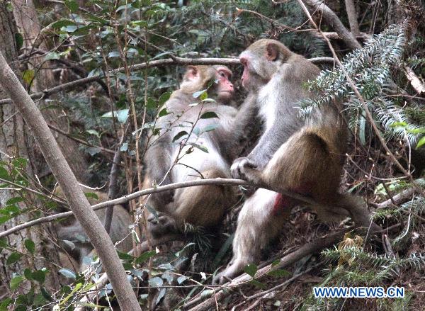 Two monkeys sit on a branch in the forest park in Zhangjiajie, central China’s Hunan Province. (Xinhua/Wang Yongji)