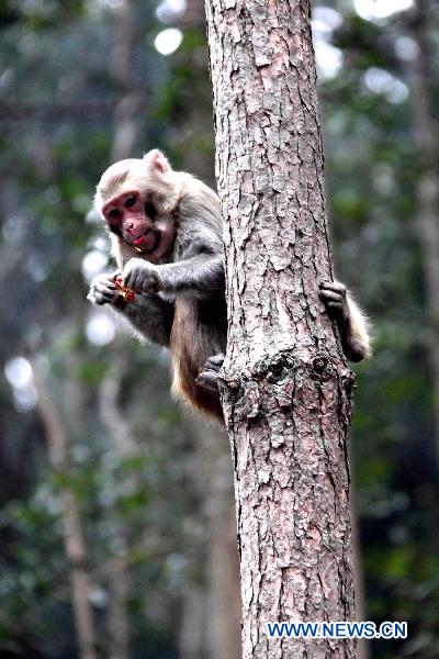 A monkey eats leaves in the forest park in Zhangjiajie, central China’s Hunan Province. (Xinhua/Wang Yongji)