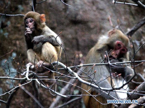 A baby monkey and its mother pose in front of the camera in the forest park in Zhangjiajie, central China’s Hunan Province. (Xinhua/Wang Yongji)