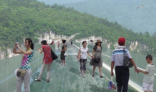 Zhangjiajie Grand Canyon Glass Bridge, The world’s tallest, longest span glass bridge,Designed by the world famous design masters Dotan Haim. height of about 400 meters, a length of about 370 meters, all with transparent glass bridge deck paving, bridge center has Bungee jumping point.