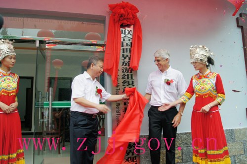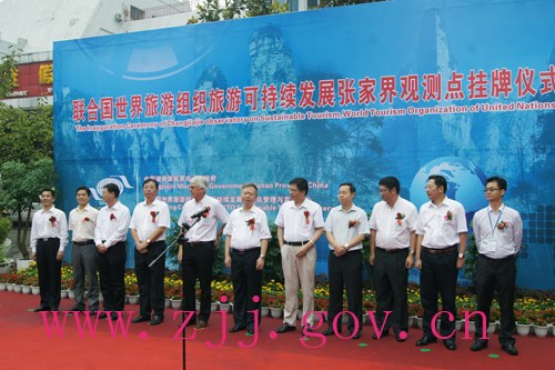 On July 14, the United Nations World Tourism Organization (UNWTO) officially set up the observatory on sustainable travel in Zhangjiajie National Forest Park. Mr. Luigi Cabrini, Director of the Sustainable Tourism Department under the UNWTO, and Mr. Hu Bojun, Secretary of the Zhangjiajie Municipal Committee of the Communist Party of China, presided over the unveiling ceremony for the observatory. Zhangjiajie mayor Zhao Xiaoming and other officials also attended the ceremony.