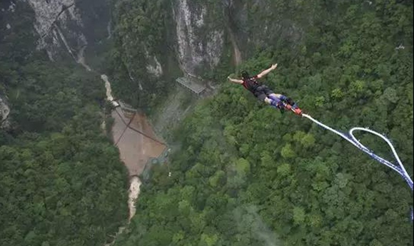 Zhangjiajie grand canyon glass bridge bungee jumping platform on the glass bridge is unique in the world, with a vertical drop of 260 meters. It is the highest commercial bungee jumping platform in the world. Of course it is also the first bungee jumping project in Zhangjiajie.