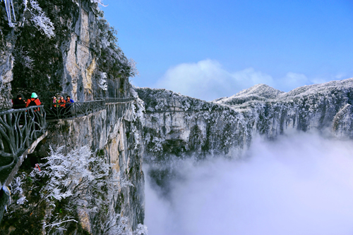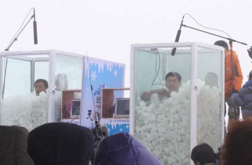 12:50 noon, two brave challenger, appear together in Zhangjiajie Tianmenshan clouds and dreams of the Peak.Zhangjiajie Tianmenshan recent days under the snow,Extreme cold weather.They were into a transparent glass container.Field staff to the glass container into the ice until the ice cover to the neck of the Challenger.Who can adhere to the longest?Along with many volunteers to participate in this event.